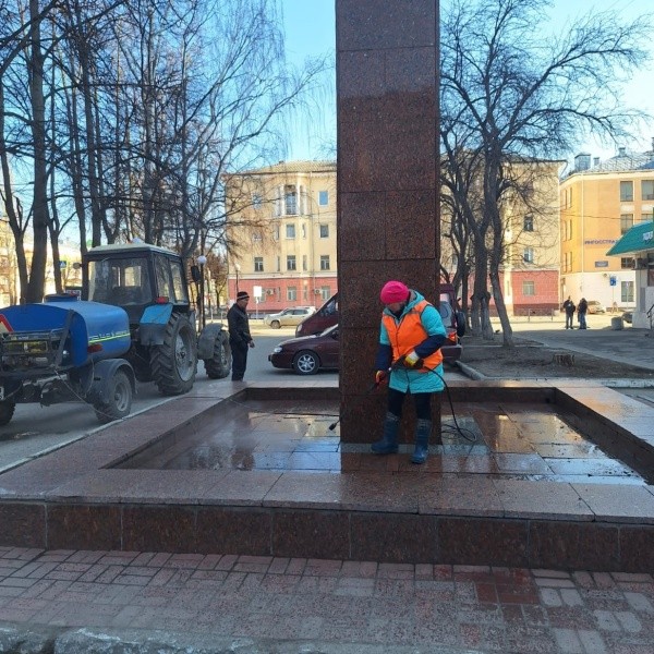 Торжественное возложение цветов к бюсту Гагарина состоится 12 апреля в 11 часов. Сегодня сотрудники АО "Город" наводят на территории порядок.