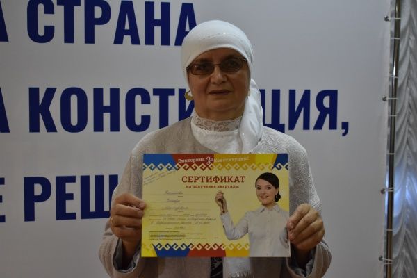В первый июльский день журналист Параньгинской районной газеты «Наша жизнь» Зинера Касимова получила радостную весть: ее номер участника викторины «За Конституцию!» стал выигрышным. Причем колесо фортуны повернулось так, что ей достался один из двух самых дорогих и желанных призов – квартира. Сегодня, 4 августа, победительница получила сертификат.