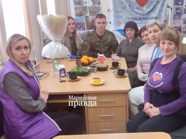 Формат мероприятия был теплый и душевный - чаепитие. Чайник с кипятком, печенье, конфеты были аккуратно разложены по вазочкам. Участницы волонтерской группы «Сердце матери» расспрашивали Алексея (позывной «Мариец») о ситуации на СВО.