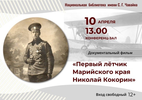 10 апреля в Национальной библиотеке им. С.Г. Чавайна состоится открытый показ историко-документального фильма «Первый лётчик Марийского края Николай Кокорин» (12+).