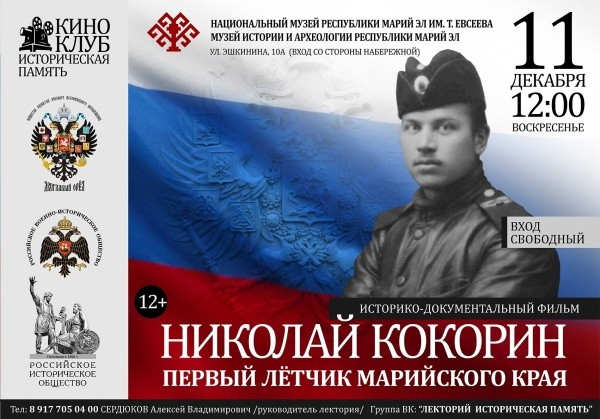 Собравшимся покажут новый историко-документальный фильм ГТРК "Марий Эл" "Первый лётчик Марийского края Николай Кокорин" (12+). Фильм расскажет о лётчике-асе Русской Императорской армии, Георгиевском кавалере, герое Первой мировой войны Николае Кирилловиче Кокорине.