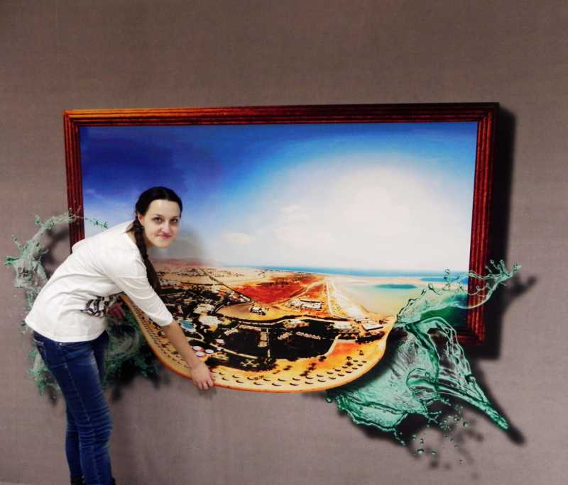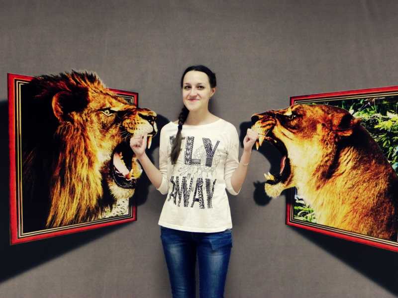 Объемная живопись – это картины, которые «оживают» на глазах. У зрителя есть возможность стать частью любой из них, потому что каждая в прямом смысле слова «выходит» за рамки. Объемные рисунки можно не только потрогать, на них можно сесть или даже лечь, чтобы слиться воедино с такой картиной. В этом и есть вся прелесть выставки. Можно сделать массу оригинальных фотографий, на которых вы кормите панду или жирафа, засовываете голову в пасть тигру, сражаетесь с динозавром, ложитесь под поезд, примеряете на себя ангельские крылья или же сидите в окружении миньонов. Смею заметить, что процесс «вхождения» в картину и подбор позы для фотографии - весьма увлекательное и веселое занятие. Каждая картина вызывает восторг и улыбку. Кроме того, для посетителей предоставлен необходимый реквизит, чтобы фотографии получились более реалистичными.