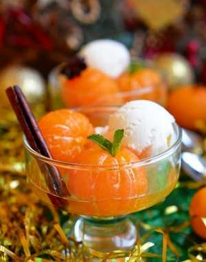 Сахар и воду довести до кипения в течение пяти минут. Добавить шафран, корицу, анис и томить на медленном огне, пока сироп не загустеет и не приобретет красивый золотой цвет. Снять с огня. Мандарины почистить от кожуры (постарайтесь убрать как можно больше белых прожилок). Положить мандарины в сироп и оставить их там до полного остывания сиропа (не забывайте их иногда переворачивать). Подавать мандарины с шариком пломбира, полив сиропом и украсив мятой.