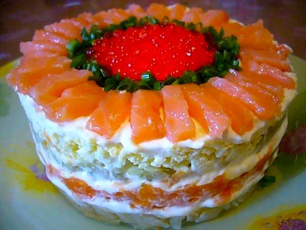 Соленая семга - 400 г, твердый сыр - 200 г, отварной картофель - 3 шт., вареные яйца - 3 шт., яблоки - 3 шт., лук — 3 шт., масло растительное для обжарки лука. майонез - 300 г, красная икра (150 г) и листья салата для украшения.
