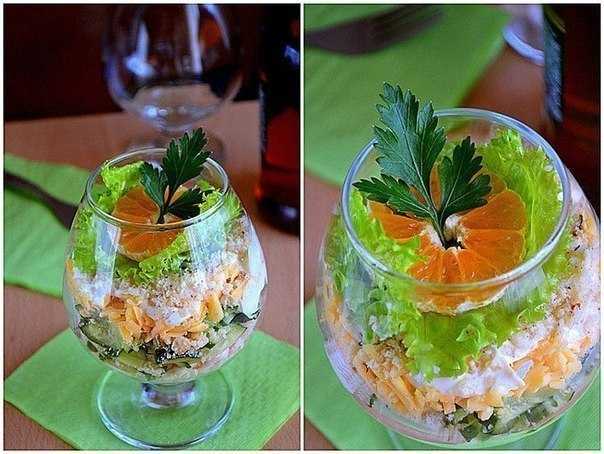 Куриного филе - 200 г, свежий огурец, 2 салатных листа, сыр - 50 г, майонез - 3 ст.л., натуральный йогурт или нежирная сметана - 3 ст.л., мандарин -1 шт., горсть орешков фундук, зелень (петрушка или укроп), соль по вкусу. Приготовление: Куриное филе сварить в подсоленной воде и оставить остывать в бульоне. Затем разобрать на волокна или мелко порезать. Сыр натереть на терке, огурцы порезать тонкой соломкой. Фундук обжарить на сухой сковороде, очистить и измельчить. Листья салата промыть, обсушить. Мандарин очистить, порезать кружочками. Если используете йогурт или сметану, то смешайте с майонезом. Соус готов. Салат лучше всего подавать в порционных вазочках или прозрачный бокалах. На дно бокала выложить порезанное куриное филе и немного соуса. Посыпать измельченными орешками. Следующим слоем будут огурцы, их посолить по вкусу. Сверху опять немного соуса и орешки. Затем натертый сыр и снова соус, орешки. И, наконец, красиво выложить порванные листочки салата, кружочек мандарина и веточку петрушки. Дать салату постоять в холоде 1-2 часа.