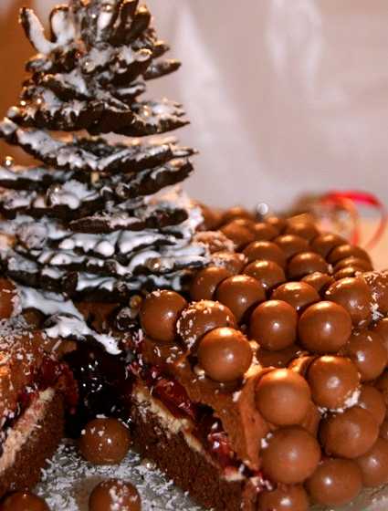 Сборка торта: поместить корж на блюдо и покрыть кремом. Вишню и 100 мл сока от нее нагреть, развести в небольшом количестве сока крахмал и залить им вишню, постоянно помешивая, чтобы получилась желированная вишня. Остудить и выстелить вишню поверх крема. Накрыть торт кольцом от формы, но не застегивать, чтобы получился небольшой зазор между краем торта и бортиками. Залить торт шоколадным муссом, чтобы он полностью покрыл торт. Накрыть пищевой пленкой и отправить на 5-6 часов в холодильник. Украсить конфетами Maltersers или по своему усмотрению.